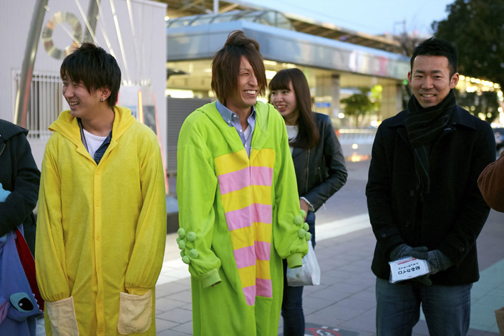 名古屋駅前で声かけを行う学生たち。色とりどりの着ぐるみ姿が通行人の目を引く