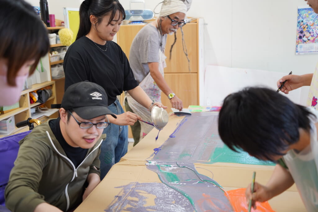 さにぃ職員の鈴木梨可さんは「今後も利用者さんが、他者との関わり合いの中で自分らしく表現できる場づくりを大切にしたい」と語ります。またワークショップに参加したアーティストユニット、BOB ho-hoのウエダトモミさんは、参加者との創作の直後、「地域の人に見てもらえる展覧会など、発表の機会を増やしていきたい」と絵具だらけの手とエプロン姿で嬉しそうに話していました。