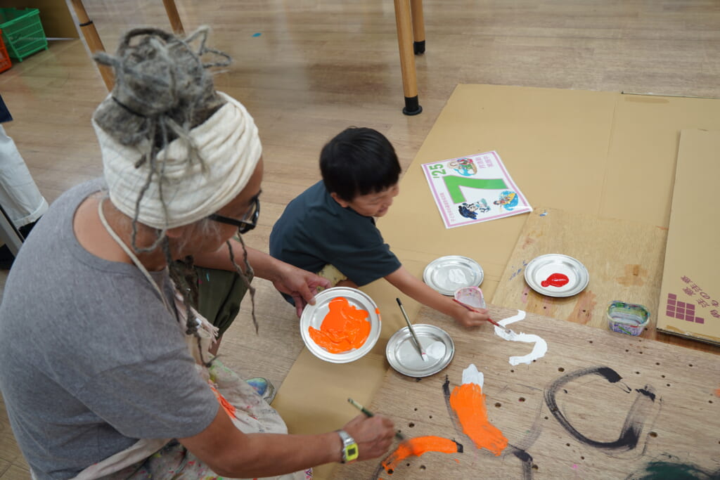 イベント当日は、参加者全員で大きな段ボールや空き箱、木材、茶筒などさまざまな素材に絵を描いたり、模様がくりぬかれた版を用いて、布や段ボールに直接インクを刷り込むシルクスクリーンプリントを楽しんだりと、参加した地域の子どもたちは普段触れることのない表現方法に夢中になっていました。