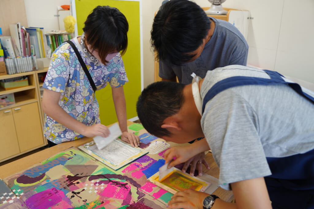 そういったアート活動を地域住民に知ってもらうため、2018年からはアーティストを招いてのワークショップを毎年開催。2025年7月31日にそれいゆで行なわれた「こども in Wonderland 日常」では、それいゆ・さにぃの利用者35人と、デザイナーのウエダトモミさんと版画摺師(すりし)のホシノマサハルさんによるアーティストユニット「BOB ho-ho(ボブホーホー)」を中心としたワークショップに、地域の子どもなど約30人が参加しました。