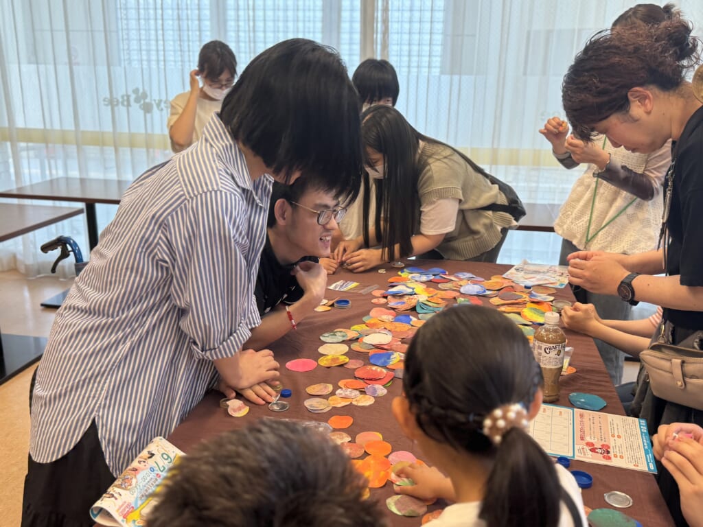 この手帳の製作をきっかけに2025年6月に静岡済生会総合病院で開催された「済生会フェア’25」では、それいゆ・さにぃの利用者がさまざまな絵や柄を描いた布を使って、オリジナルの缶バッジを作るワークショップが開かれ、約50人が参加しました。それいゆで行なわれたアートワークショップと同様、障害の有無を問わず、参加者同士で交流しながらものづくりが行なわれました。