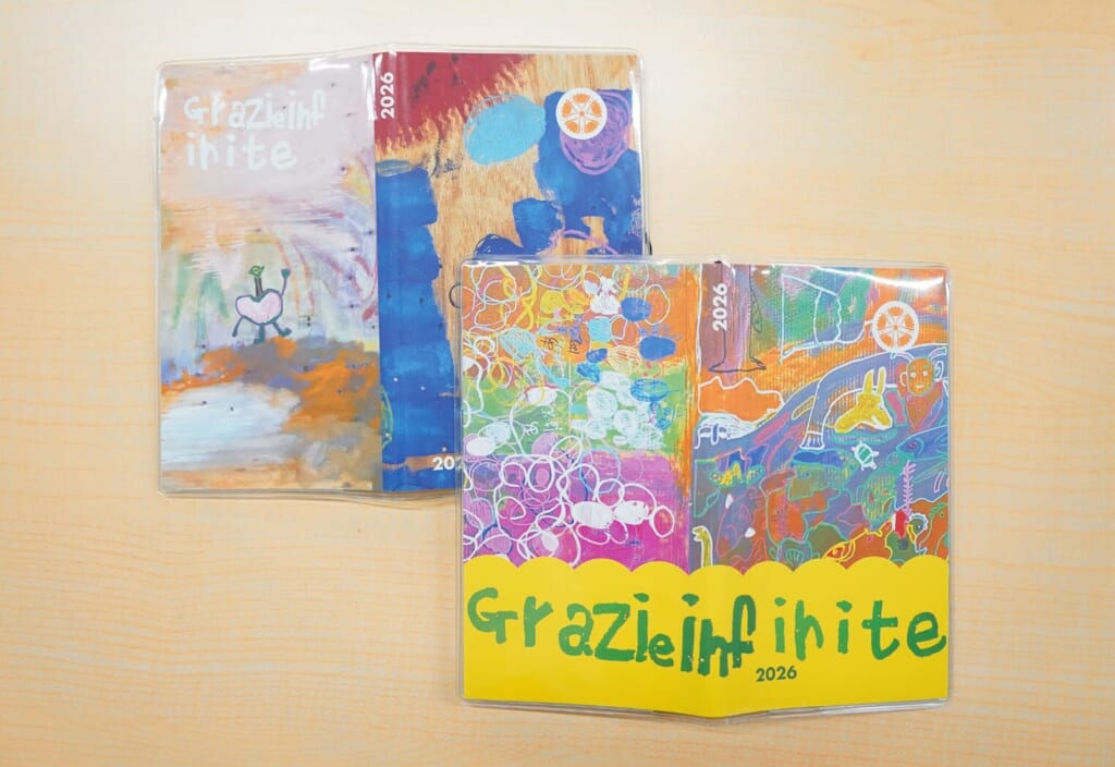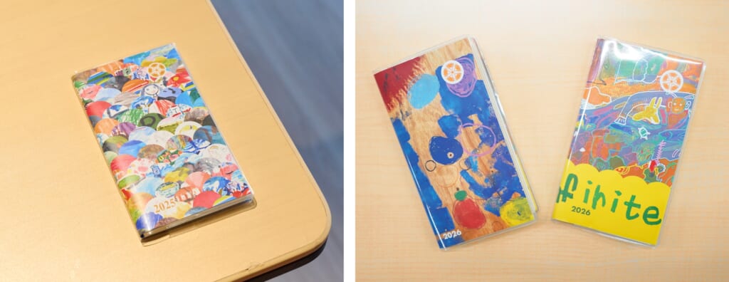 (左)2025年版の済生会手帳は「済生会発達支援事業所きっずてらす」(北海道)の子どもたちが描いた絵や文字をもとにした「小樽フォント」を採用。全国に広がる「ご当地フォント」についてはこちらの記事で詳しく紹介しています。(右)ひまわり事業団の作品が採用された、2026年版の済生会手帳