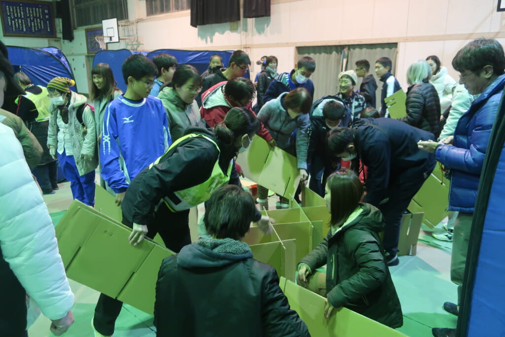 また、夜間は新聞紙6枚分のスペースが一人ひとりに割り当てられ実際に体育館での宿泊を体験。冬の体育館の底冷えや、段ボールベッドの寝心地、体育館に響く夜間の足音など、避難所の過酷さを生で実感することで、避難所生活に向けてそれぞれが備えておいた方が良い物品や心持ちについて考えます。